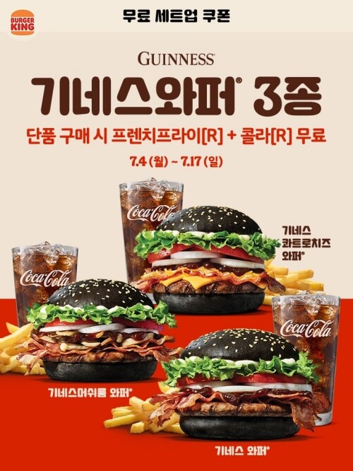 버거킹 행사 두 번째로 받을 수 있는 쿠폰은 기네스를 사용한 번이 맛있는 기네스와퍼 3종에 대해 무료 세트업 할 수 있는 것입니다. 단품 구매시 프렌치프라이와 콜라를 받을 수 있어요.