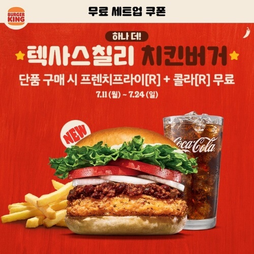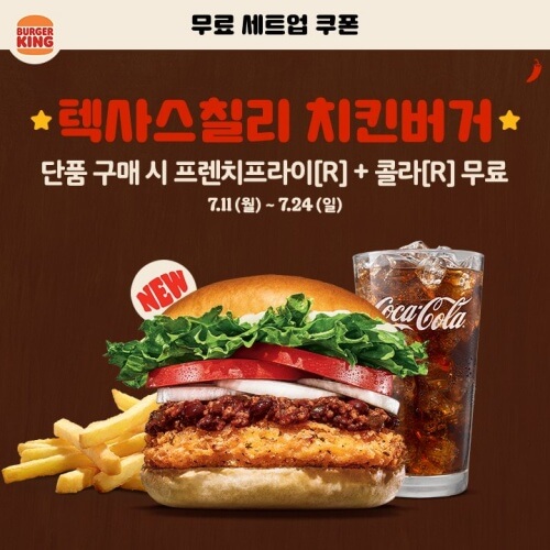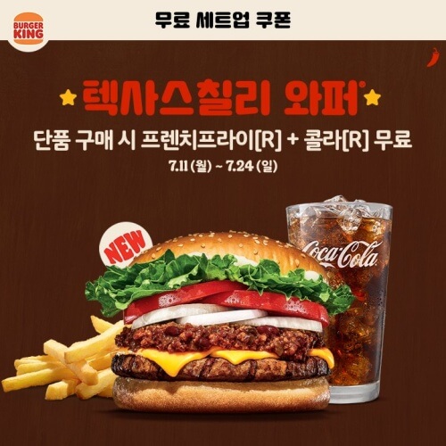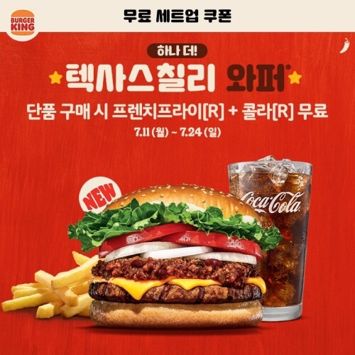가장 최근에 나온 버거킹 신메뉴 텍사스칠리 와퍼, 텍사스칠리 치킨버거의 무료 세트업 쿠폰입니다. 버거킹 행사 때마다 빠지지 않는게 세트업 쿠폰인데, 이번에는 두 번씩 받을 수 있게 나눠줬습니다.
