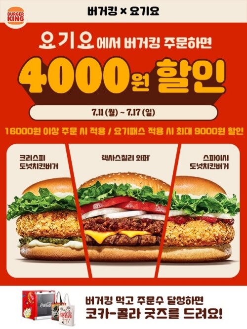 버거킹 행사에서 빠지지 않는 것 중 하나가 딜리버리 할인이지요. 이번 주는 요기요에서 16000원 이상 주문하면 4000원을 할인 받을 수 있습니다. 요기패스 적용까지 하면 최대 9000원 할인됩니다.