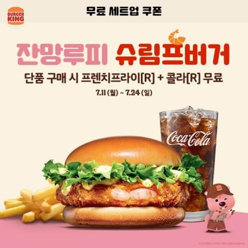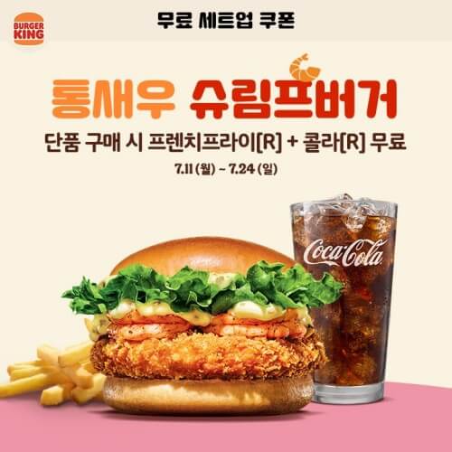 버거킹 행사 4번째 무료 세트업 쿠폰은 슈림프 버거 3종입니다. 잔망루피 슈림프버거부터 통새우 슈림프버거, 비프&슈림프버거 3종에 대해서 무료 세트업이 가능합니다.