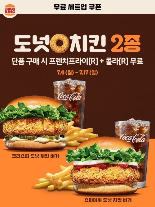 버거킹 이벤트 쿠폰 세번째는 도넛 치킨 2종 무료 세트업입니다. 이제 감자 수급이 좀 나아졌나봅니다. 어니언링으로 세트업 해 주는 것은 없네요.