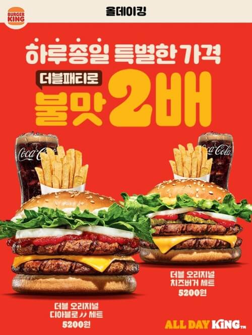 맥도날드에는 맥런치가, 롯데리아에는 착한 점심이 있다면 버거킹에는 한 술 더 뜬 '올데이킹'이 있습니다. 하루 종일 착한 가격으로 버거를 먹을 수 있는 버거킹 행사 아닌 행사라고 할 수 있죠.