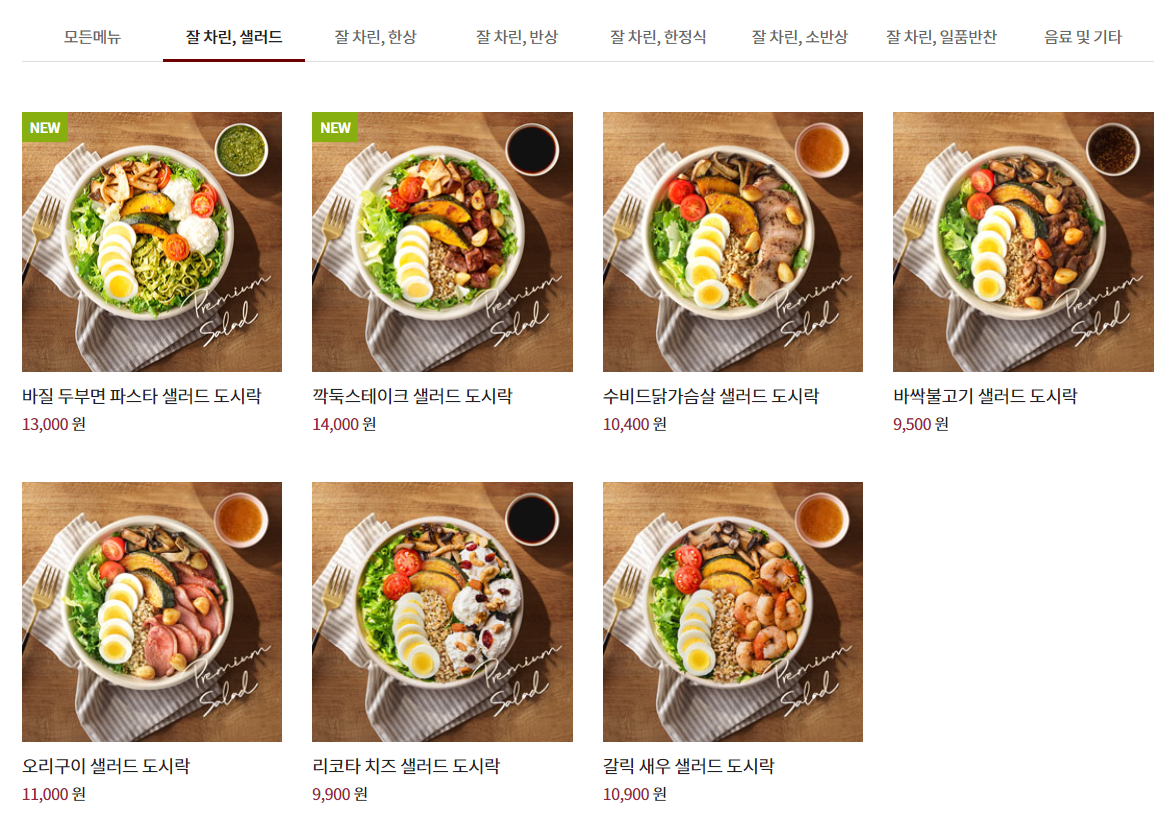 본도시락 홈페이지에 가보면 '잘 차린, 샐러드'라는 카테고리에 샐러드 메뉴가 여러개 있는 것을 볼 수 있다. 비주얼만 보면 여느 샐러드 전문점에 전혀 뒤쳐지지 않는 구성이라 볼 수 있다.