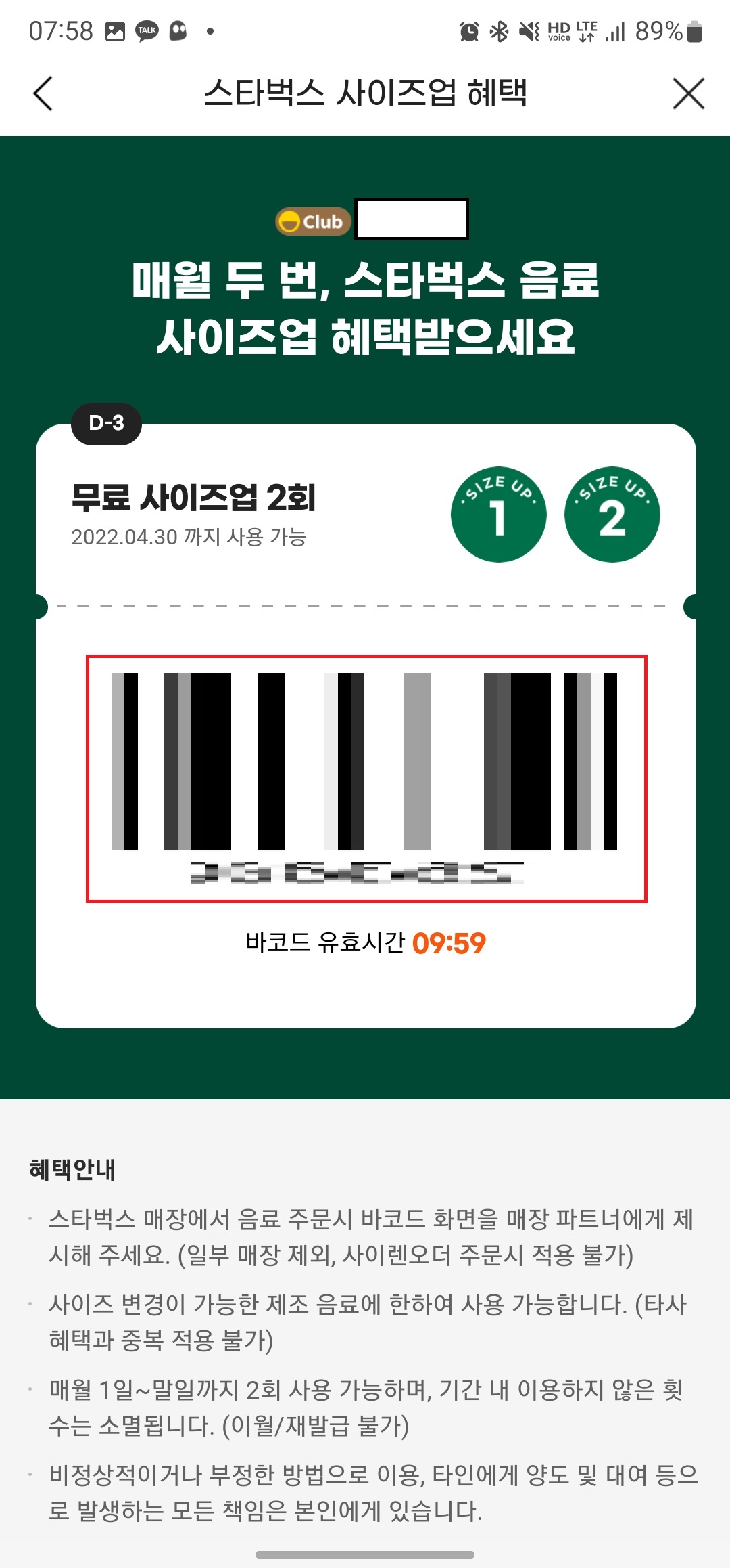 한번에 2번 사이즈업이 가능해서 톨 사이즈에서 벤티로 바로 올라갈 수 있습니다. 즉, 저 배너를 눌러서 나오는 아래 바코드 화면을 파트너에게 보여주고, 2번 찍어달라고 하면 톨에서 벤티로 사이즈업 할 수 있는 것이에요.