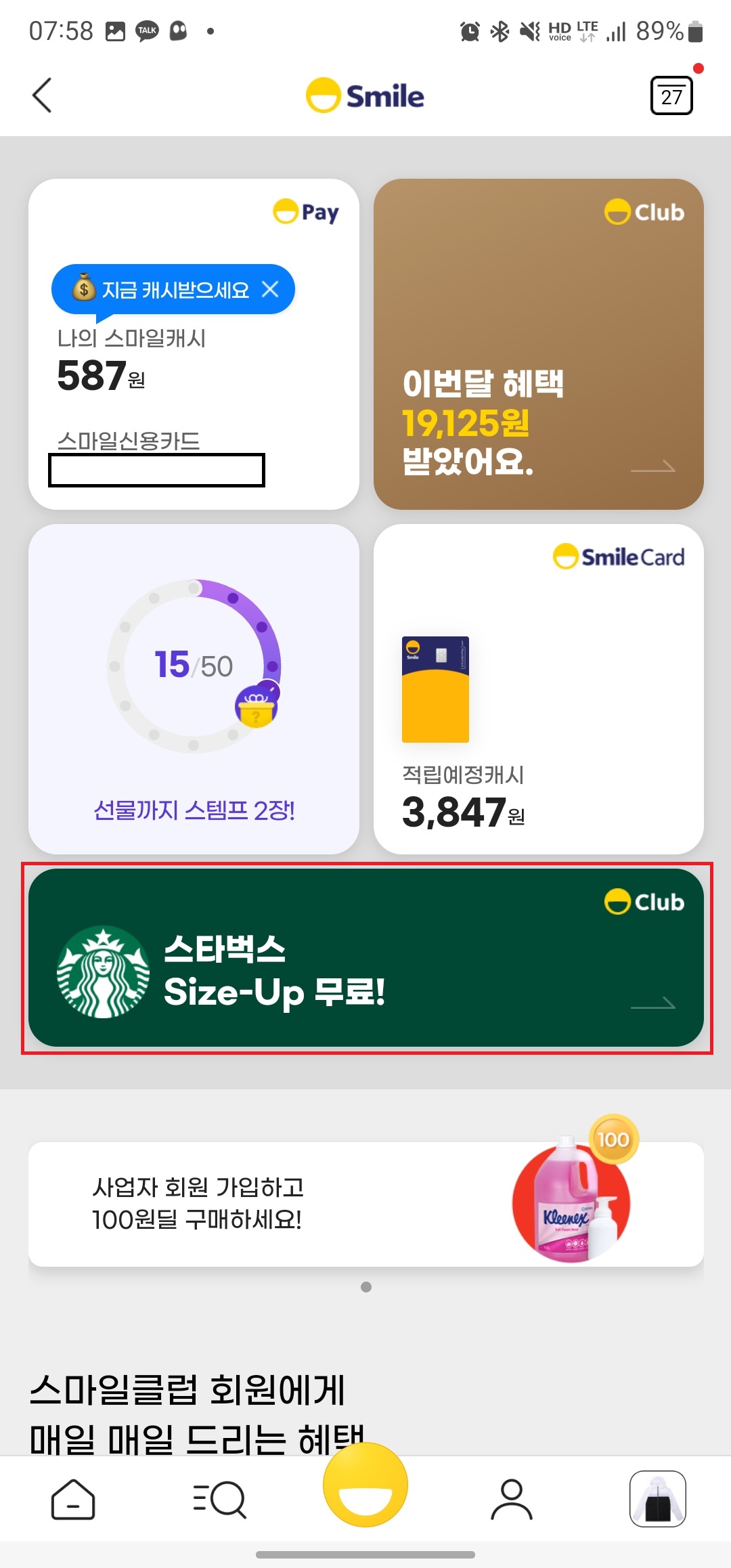 그럼 스마일클럽 회원 페이지가 나오고, 그곳에 스타벅스의 고유 색상인 진한 녹색과 함께 스타벅스 사이즈업 무료 배너가 바로 보입니다.