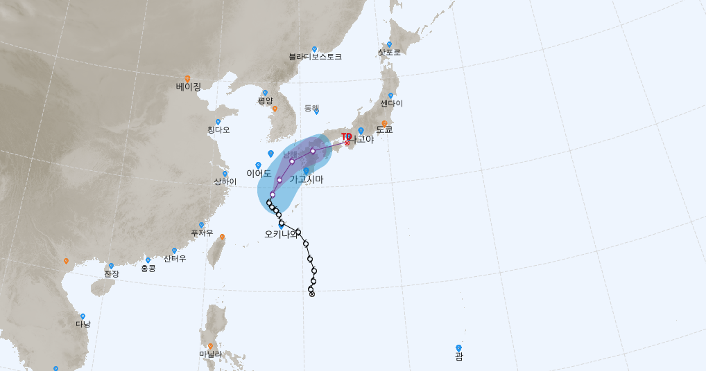 위 지도만 보면 오키나와에서 멀지 않은 곳에서 태풍으로 발달했기 때문에 태풍 경로 예상이 크게 벗어나는 것 없이 잘 맞을 것으로 보입니다.