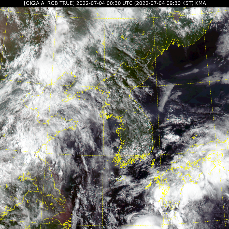 천리안 위성 영상으로 살펴보면, 태풍으로 인한 비구름이 남쪽에 살짝 보이기 시작합니다. 우리나라로는 안 오고 일본으로 진출할 예정입니다.