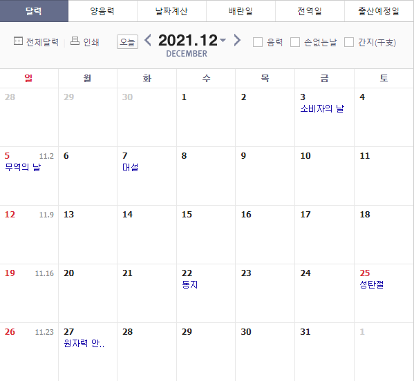 2021년 12월의 달력을 한 번 살펴보겠습니다. 25일 빨간날입니다. 직장인들이 좋아하는 빨간날. 그런데, 위치가 참 그렇죠? 네, 그렇습니다. 토요일에 들어가 있습니다.
