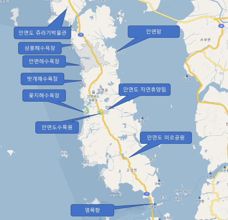 아래는 안면도 가볼만한 곳들을 정리한 것입니다. 중간을 가로지르는 77번 국도를 중심으로 가볼만한 곳이 동서로 놓여 있습니다.